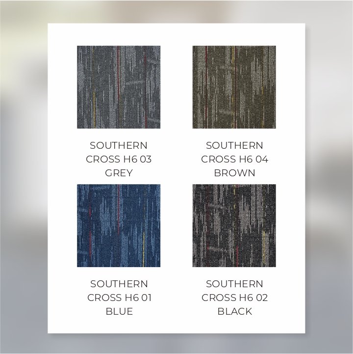 Karpet Tile Southern Cross menampilkan desain motif garis yang elegan dan bersih. Garis-garis ini memberikan struktur visual dan kesan estetika yang timeless, cocok untuk menciptakan ruang kantor yang berkelas. - Warna Highlight yang Memukau